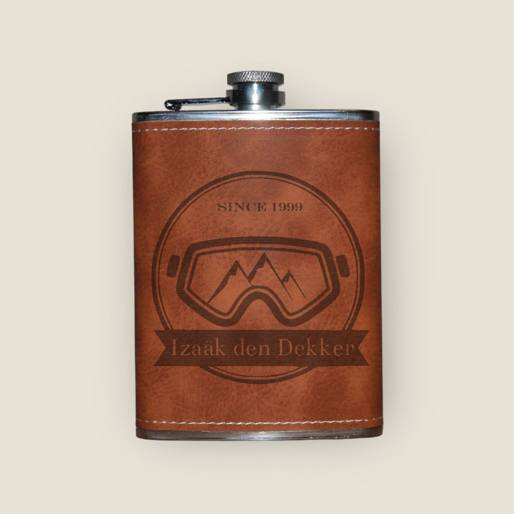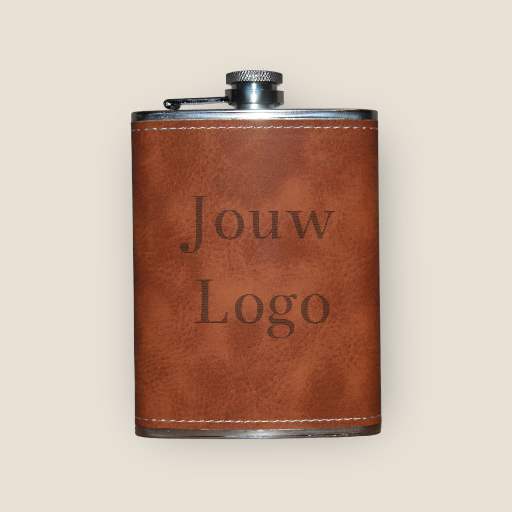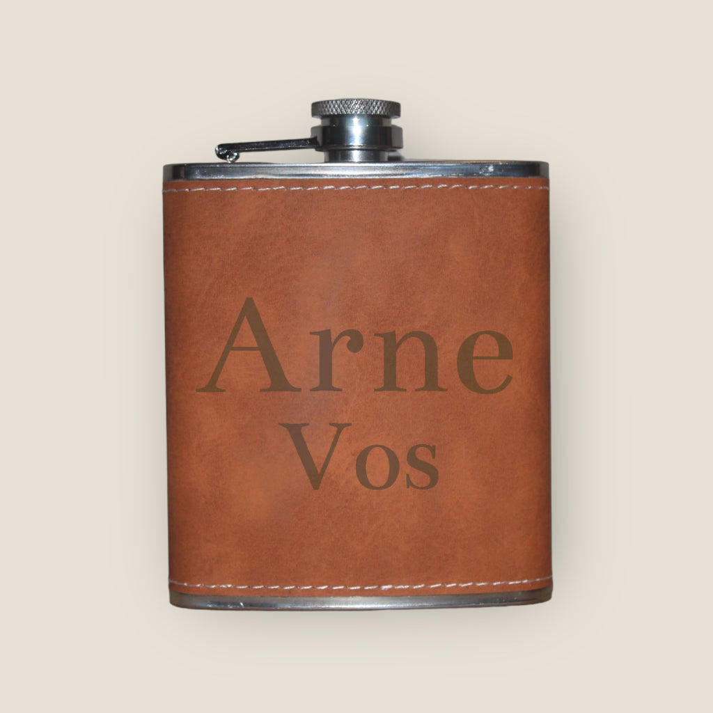 Wil je een origineel en tijdloos cadeau geven, of wil je zelf deze toffe zakflacon laten personaliseren. Ga dan voor deze luxe zakflacon met leder look. Wij hebben 7 standaard ontwerpen gemaakt waar u uit kunt kiezen. Kies een van deze ontwerpen als optie bij uw bestelling, voeg daarna de tekst toe die u op de fles gegraveerd wilt hebben. En wij gaan direct voor u aan de slag!