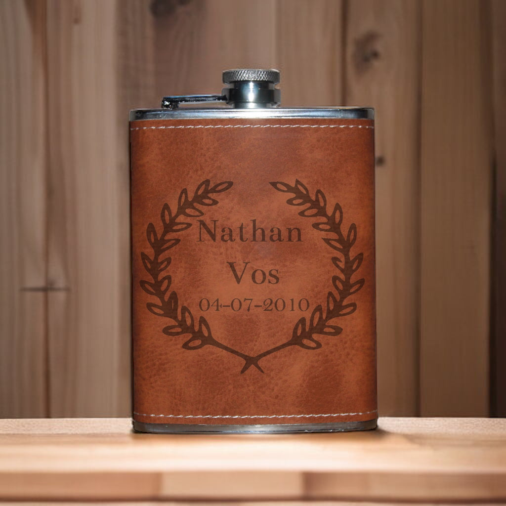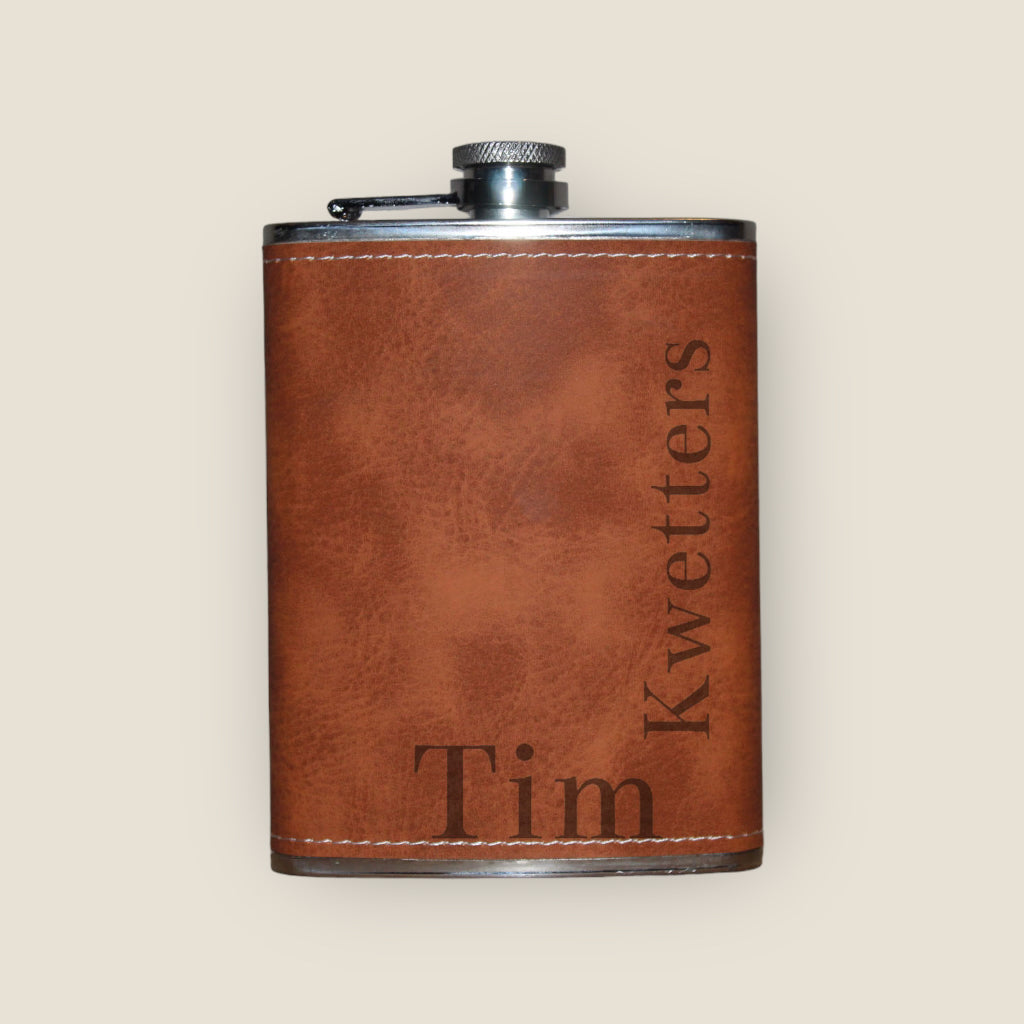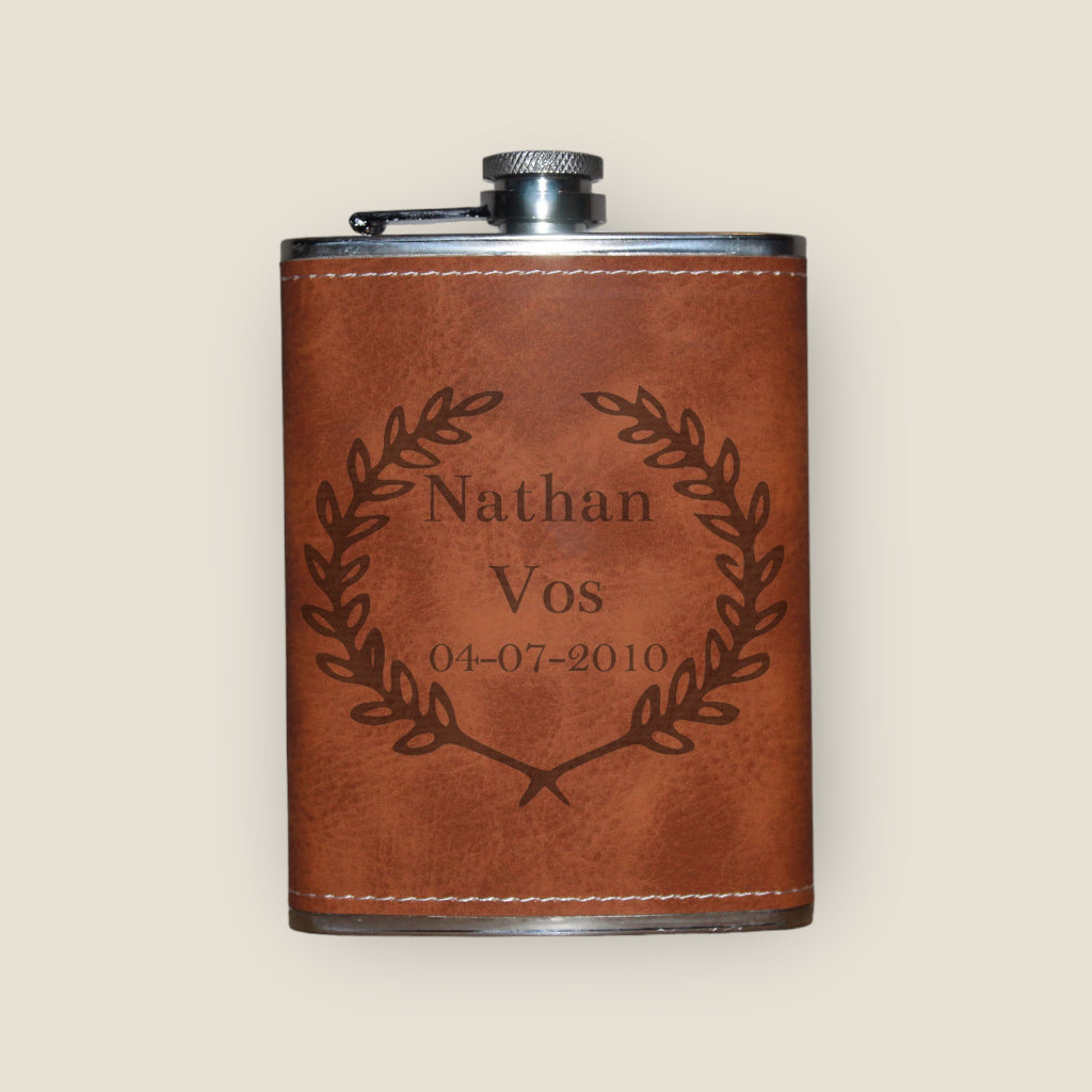 Wil je een origineel en tijdloos cadeau geven, of wil je zelf deze toffe zakflacon laten personaliseren. Ga dan voor deze luxe zakflacon met leder look. Wij hebben 7 standaard ontwerpen gemaakt waar u uit kunt kiezen. Kies een van deze ontwerpen als optie bij uw bestelling, voeg daarna de tekst toe die u op de fles gegraveerd wilt hebben. En wij gaan direct voor u aan de slag!